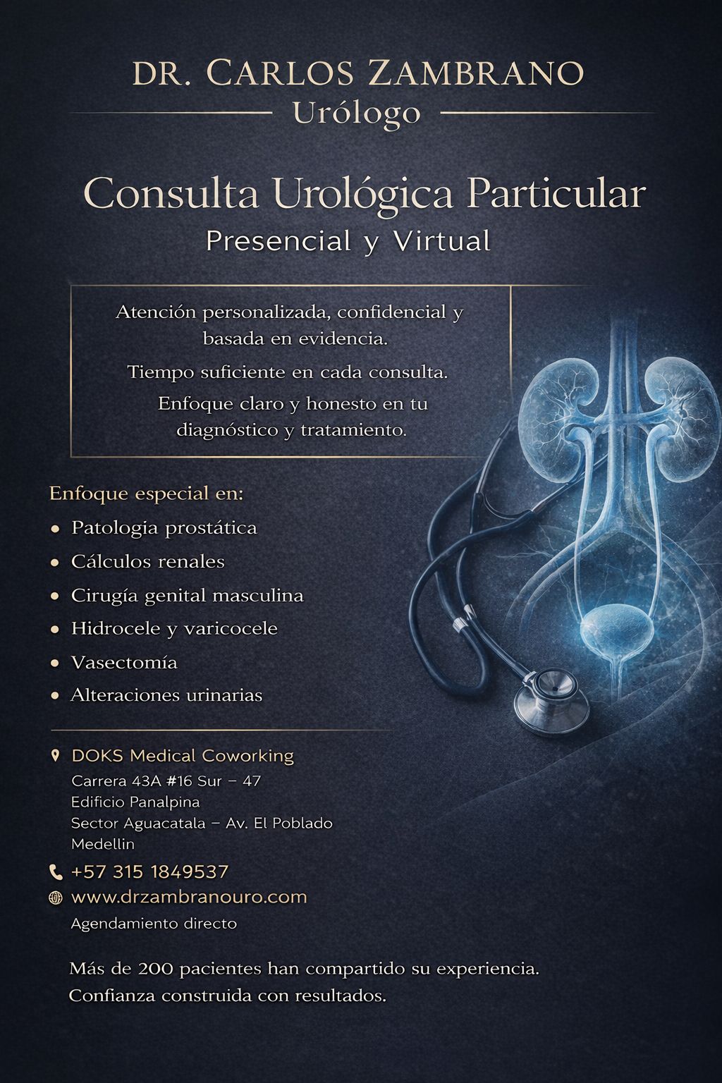 Soy el Dr. Carlos Zambrano, médico cirujano y Urólogo de la Universidad CES, docente adscrito de la especialización en Urología y miembro de la Sociedad Colombiana de Urología (SCU) y la Asociación Europea de Urología (EAU).